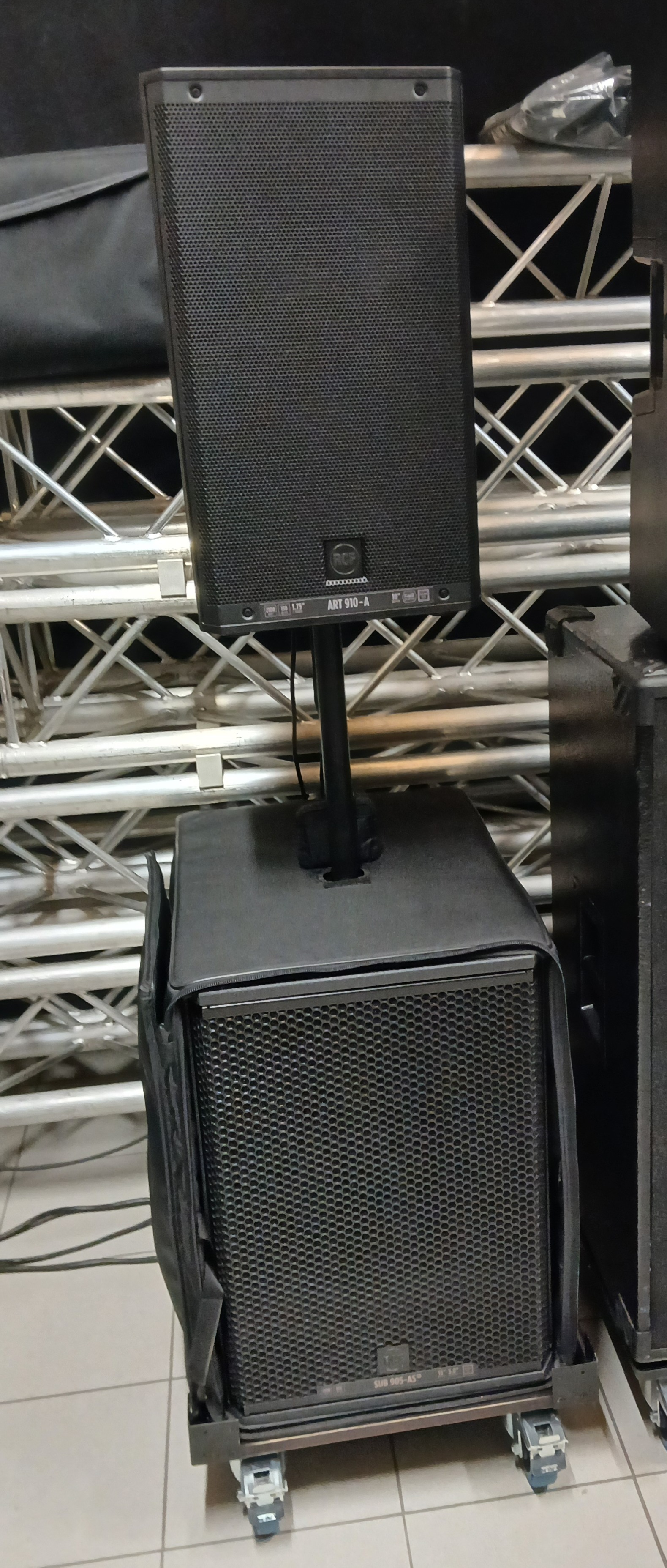 - 2 kleine boxen op statief 10 inch speaker, RCF 910-A met ingebouwde versterker van 1050w Rms en heel veel bas output en glashelder in het hoog, zonder agressief te klinken !